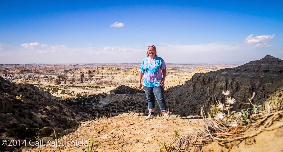 I stopped at another picnic overlook and did some more wandering. Absolutely incredible vistas around. The bikers rolled up as I was walking back, and they were the folks in the 5th wheel. Nice folks, from Houston. They said they had made the hike out to the end and it was VERY narrow & steep. They said they had been watching me.....said when I turned back "I guess she didn't see the path went on". I said, "Oh I saw it....just didn't think it was a great idea by myself as who would know if I tumbled to the bottom?" We had a nice chat but I finally hit the road for real. I headed to the De Na Zin trailhead. I got there about 4:30. I walked for a bit but I kept thinking of the guidebooks that said Bisti was so much better so I decided to head there. Supposedly the dirt road I was on went all the way through 12 mi to 371, another paved highway, then Bisti was @ 10 mi north. Well 7500 (the dirt road) was ok for 80% of the time. 20% was white knuckled, hang on, shit flying out of cabinets, OMG I hope the wheels stay on, washboard. Really awful. And I was driving straight into the sun at the end praying I didn't hit a cow, truck or drive off a cliff. I got to NM371 and turned north, loving the all too brief stretch of wonderful asphalt.